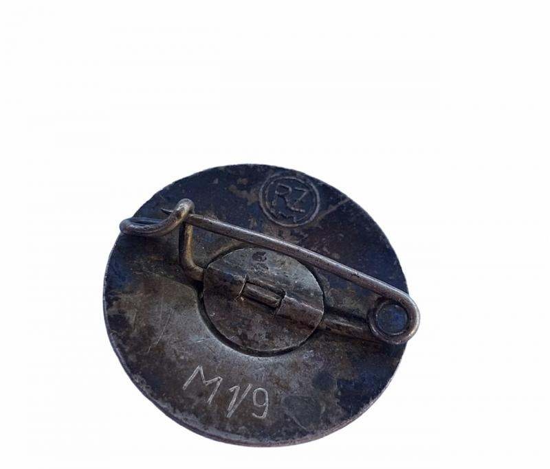 Original German NSDAP membership pin. A so-called "parteiabzeichen". The pin is stamped RZM m1/9, indicating that this badge was made by Robert Hauschild from Pforzheim. Hard to find maker! In a worn but neat condition.
