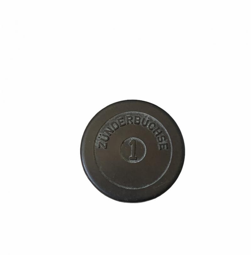 Original bakelite German fuse container. A so-called 'Zunderbuchse'. This dark brown container is maker marked and dated 1938. In a neat condition.