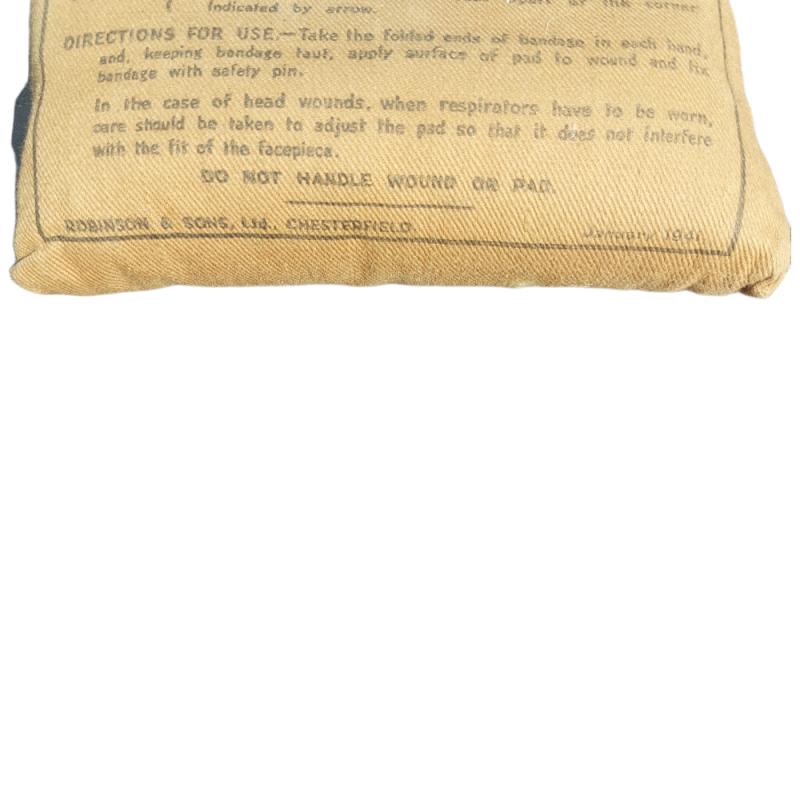 Wartime English military bandage. A so-called Shell dressing. The bandage is maker (Robinson & Sons. LTD., Chesterfield) and dated january 1941. The dressing is in unused condition.