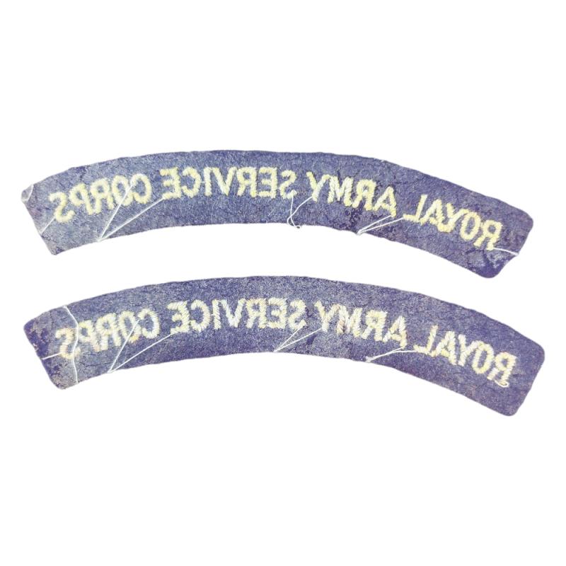 Nice original pair of embroidered shoulder titles of the British Royal Army Service Corps. The set is in mint condition. Hard to find pair of R.A.S.C. Shoulder titles.