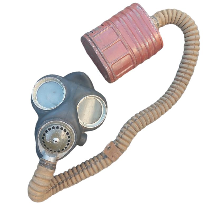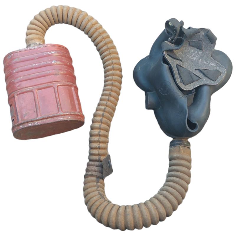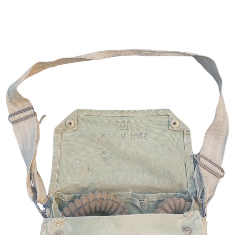 Beautiful 1st model of the British gas mask with accompanying carrying bag. The carrying case is named and dated 1943. The gas mask itself is from 1941.