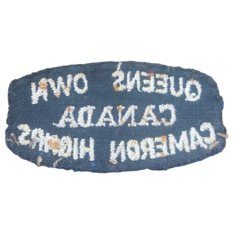 Embroidered Canadian shoulder title of the 'Queens Own Cameron Highlanders of Canada'. This Canadian unit came into action in Dieppe, Normandy and during the Battle of the Scheldt. The title is in used condition.
