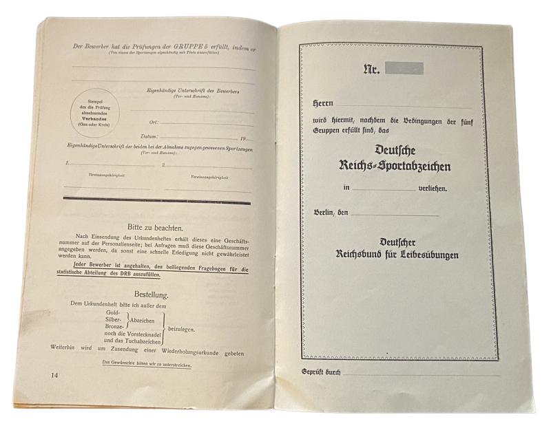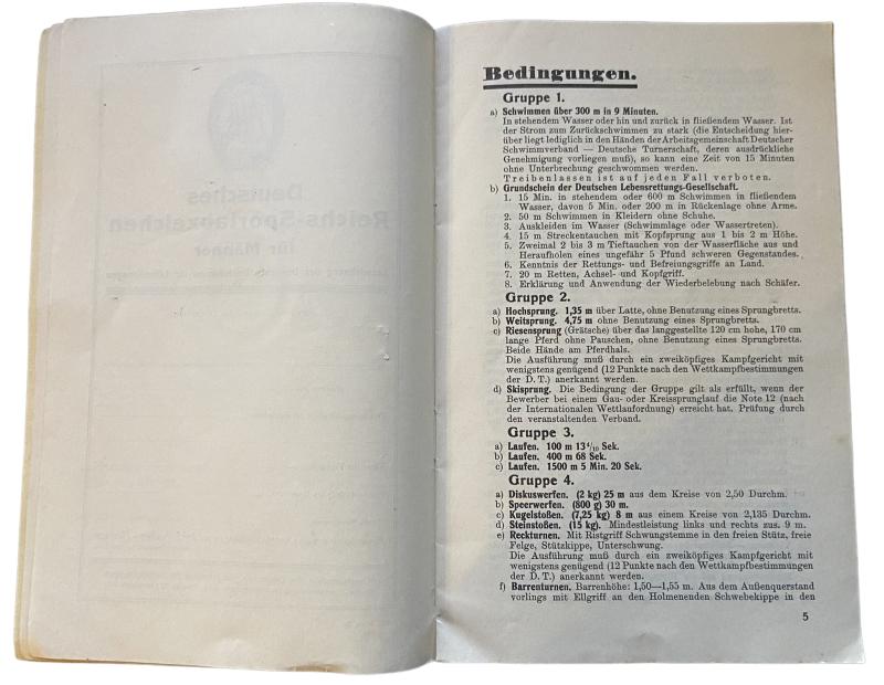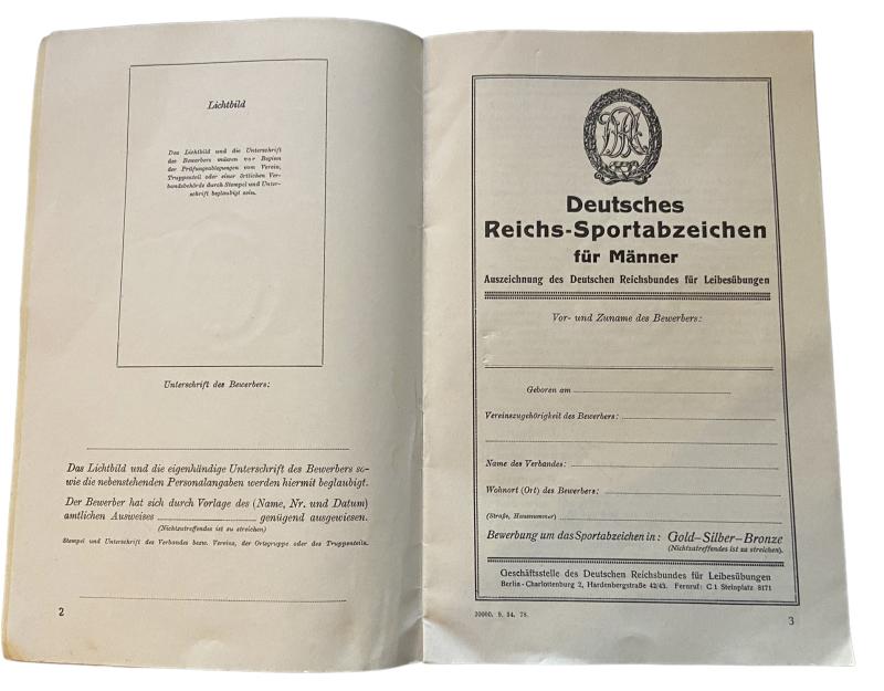 A nice booklet for a DRL Sports Badge (Deutsches Reichssportabzeichen), constructed of off-white paper with eight pages of rules and stipulations for the awarding of the badge. Measuring 143 mm (w) x 220 mm (h), in unused and fine condition.