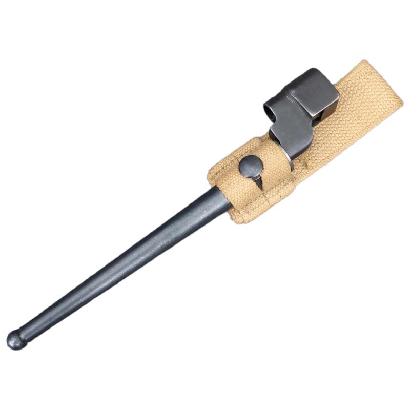 Neat spike bayonet in a Canadian frog. The frog is maker marked and dated 1942. The whole is in good condition.