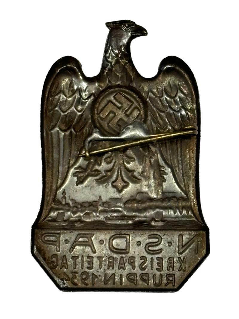 Reichsparteitag Ruppin 1934 badge. Hollow tombak construction, repaired with soldered on set up. Very rare badge