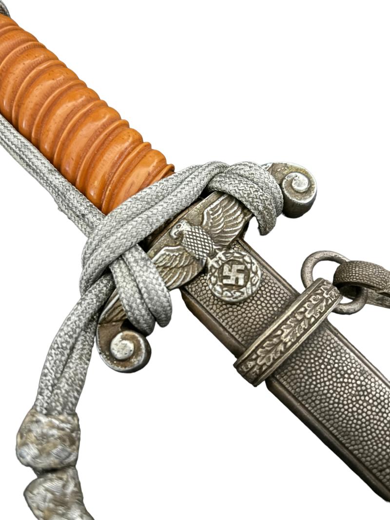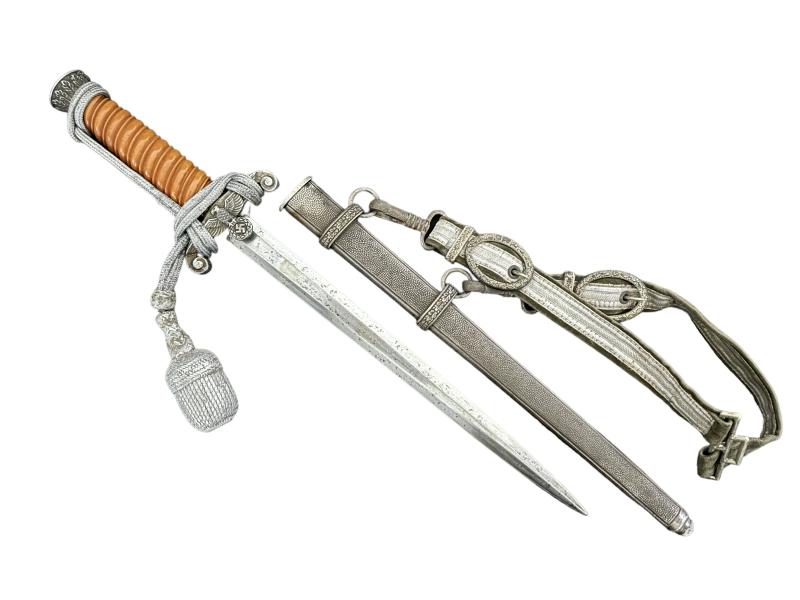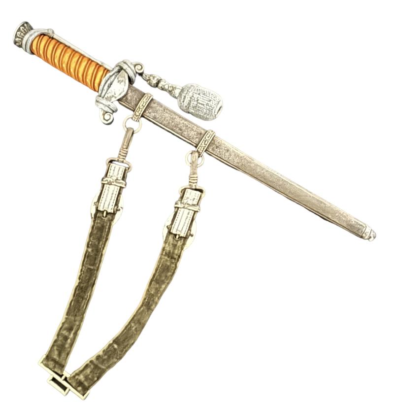 Nice worn German Army Dagger (Heeresdolch) made by E.& F. Hórster, complete with portepee and hanger. Nice patina and no cracks in the grip. Complete dagger, nice for display.