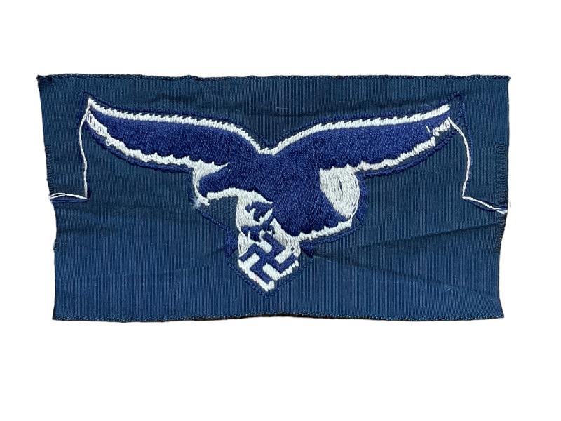 Variant of the Luftwaffe breast eagle. A woven example by BeVo on blue cloth. To be worn on the four pocket/dress tunic.